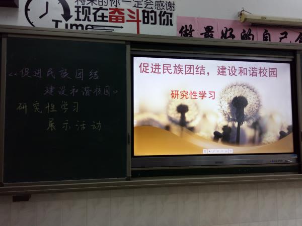 活动中,研究性学习第1—5小组展示了他们精心制作的“各民族风采”课件,课件以生动形象的方式向同学们展示了5个民族的历史、饮食、服饰、风俗习惯、建筑等方面,增长了大家对民族的了解,并谈了参与本次活动的感受和收获;第六小组讲述了他们从设计调查问卷、确定采访题目到采访同学老师、分析问卷、形成结论的整个过程中成员如何分工合作,如何克服困难等情况。第七小组也就他们如何上网调查资料、如何咨询政治老师等方面和大家进行了分享。在大家收获了知识、提升实践能力的同时,同学们也向全校师生发出倡议,从每个人、每件小事做起,培养民族自尊心和自豪感,提高民族素养,自觉维护民族团结和国家稳定,建设和谐校园。