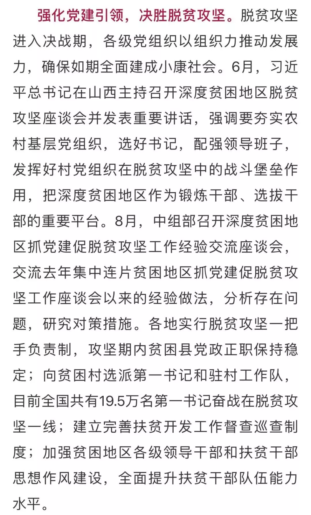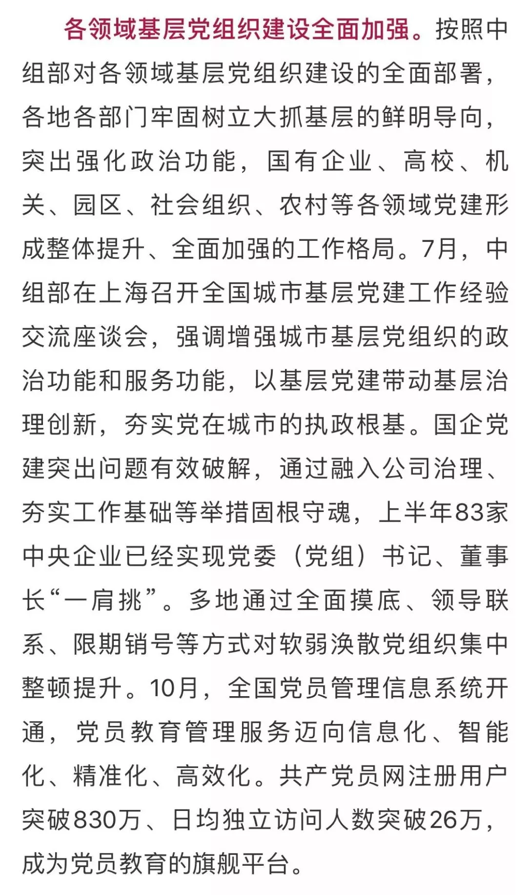 推进“两学一做”学习教育常态化制度化。在深入总结去年“两学一做”学习教育成功实践的基础上,3月,中共中央办公厅印发了《关于推进“两学一做”学习教育常态化制度化的意见》,并发出通知,要求各地区各部门认真贯彻落实。4月,推进“两学一做”学习教育常态化制度化工作座谈会在京召开,强调要在真学实做上深化拓展,注重融入日常、抓在经常,引导广大党员深入学习党章党规,深入学习习近平总书记系列重要讲话精神和党中央治国理政新理念新思想新战略。中央组织部开设“两学一做”官网,浏览量超过5000万次。各级党组织纷纷制定实施意见,通过规范组织生活、落实“三会一课”、丰富主题党日载体、扎实开展谈心谈话等方式,让每一位党员都成为党的健康细胞、每个支部都成为党的坚强堡垒。